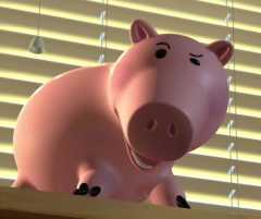 In the Toy Story films, Hamm the pig appears. What role does Hamm often play when the main character Andy plays with him?