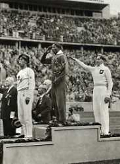 The greatest athlete of the Berlin Olympics with four gold medals stands at the top of the podium. His name? (First and last name)